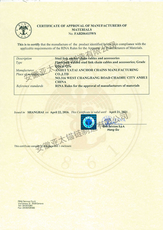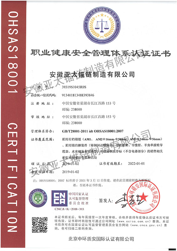 安徽亞太錨鏈制造有限公司是國家高新技術(shù)企業(yè),也是國家GB/T 549-2017《電焊錨鏈》標(biāo)準(zhǔn)的起草和制定單位之一。公司旗下設(shè)有錨鏈分廠、浮標(biāo)分廠、舾裝件分廠等多個(gè)分廠。公司專業(yè)從事φ12.5mm-φ107mm二、三級(jí)船用錨鏈、浮標(biāo)錨鏈、錨鏈附件,錨、船舶曬裝產(chǎn)品、航標(biāo)、系船浮、船型標(biāo)、多種規(guī)格海洋監(jiān)測浮標(biāo)及航標(biāo)燈等產(chǎn)品的生產(chǎn)、安裝和服務(wù)。目前公司的產(chǎn)品銷往全國各地船廠、碼頭、航標(biāo)處、航道局、海洋局,并已走上國際市場,如東南亞、中東、歐美等國家。